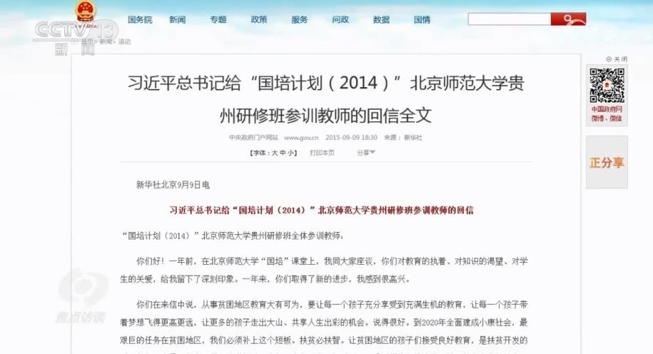 2015年8月,黃俊瓊和一起參加“國(guó)培計(jì)劃(2014)”北京師范大學(xué)貴州研修班的其他教師給習(xí)近平總書(shū)記寫(xiě)了一封信,匯報(bào)他們一年來(lái)的工作。很快,習(xí)近平總書(shū)記給他們回信了,在信中,總書(shū)記勉勵(lì)他們,努力做教育改革的奮進(jìn)者、教育扶貧的先行者、學(xué)生成長(zhǎng)的引導(dǎo)者,為貧困地區(qū)教育事業(yè)發(fā)展、為祖國(guó)下一代健康成長(zhǎng)繼續(xù)作出自己的貢獻(xiàn)。