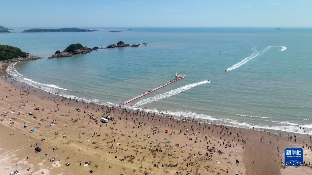 5月2日,游客在浙江省舟山市朱家尖大青山里沙景區(qū)游玩(無人機照片)。