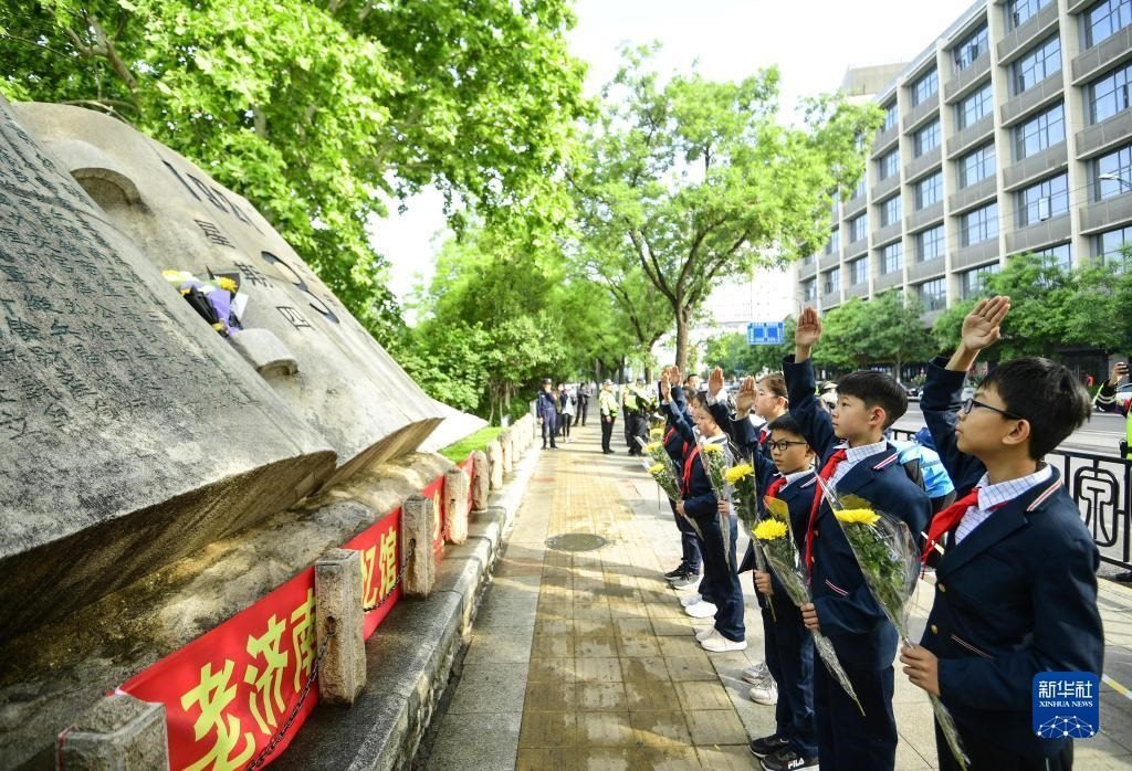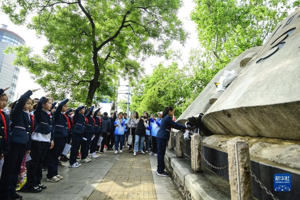 5月3日,小學(xué)生在“五三慘案”紀(jì)念碑前悼念。