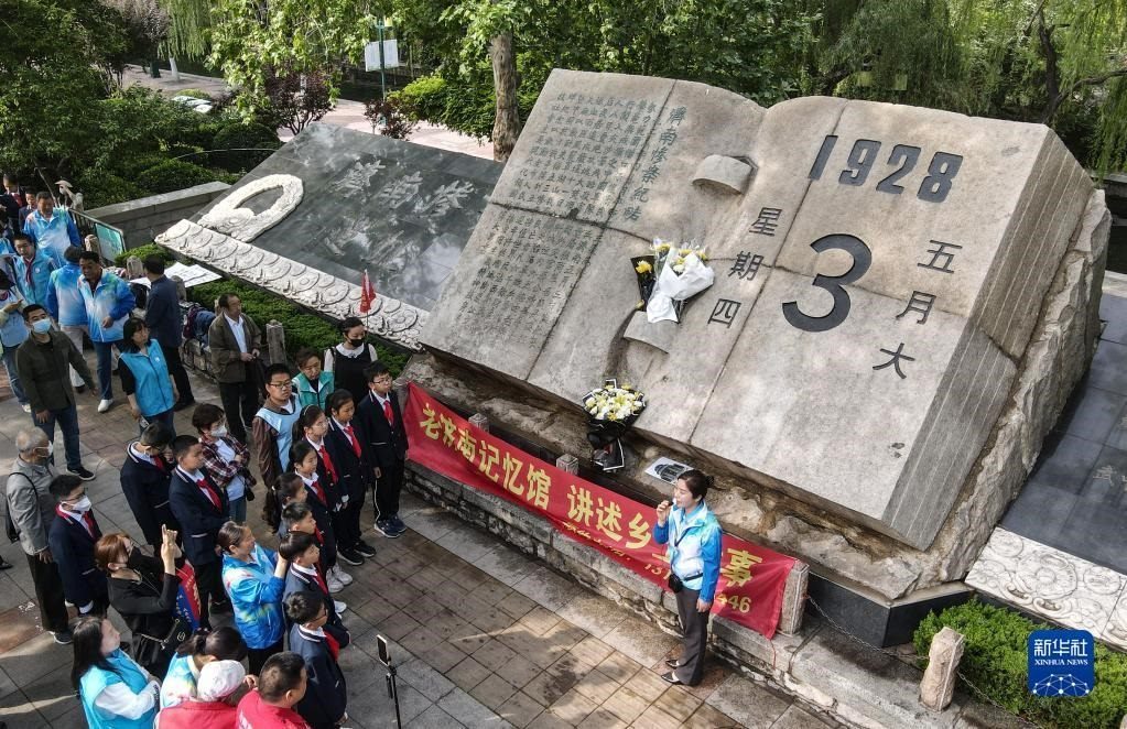 5月3日,小學(xué)生在“五三慘案”紀(jì)念碑前聽志愿者講述歷史。