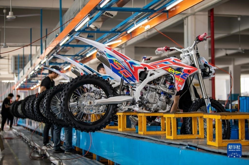 5月4日,在浙江省金華市武義縣桐琴鎮(zhèn)五金工業(yè)區(qū)的一家企業(yè),工人趕制準(zhǔn)備銷往海外的越野摩托車。