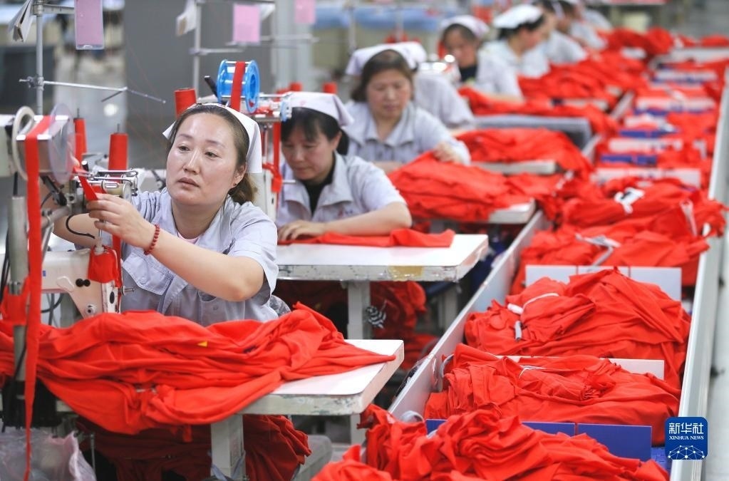 5月4日,在山東省青島市即墨區(qū)一家服裝企業(yè),工人生產(chǎn)出口到海外市場的服裝。