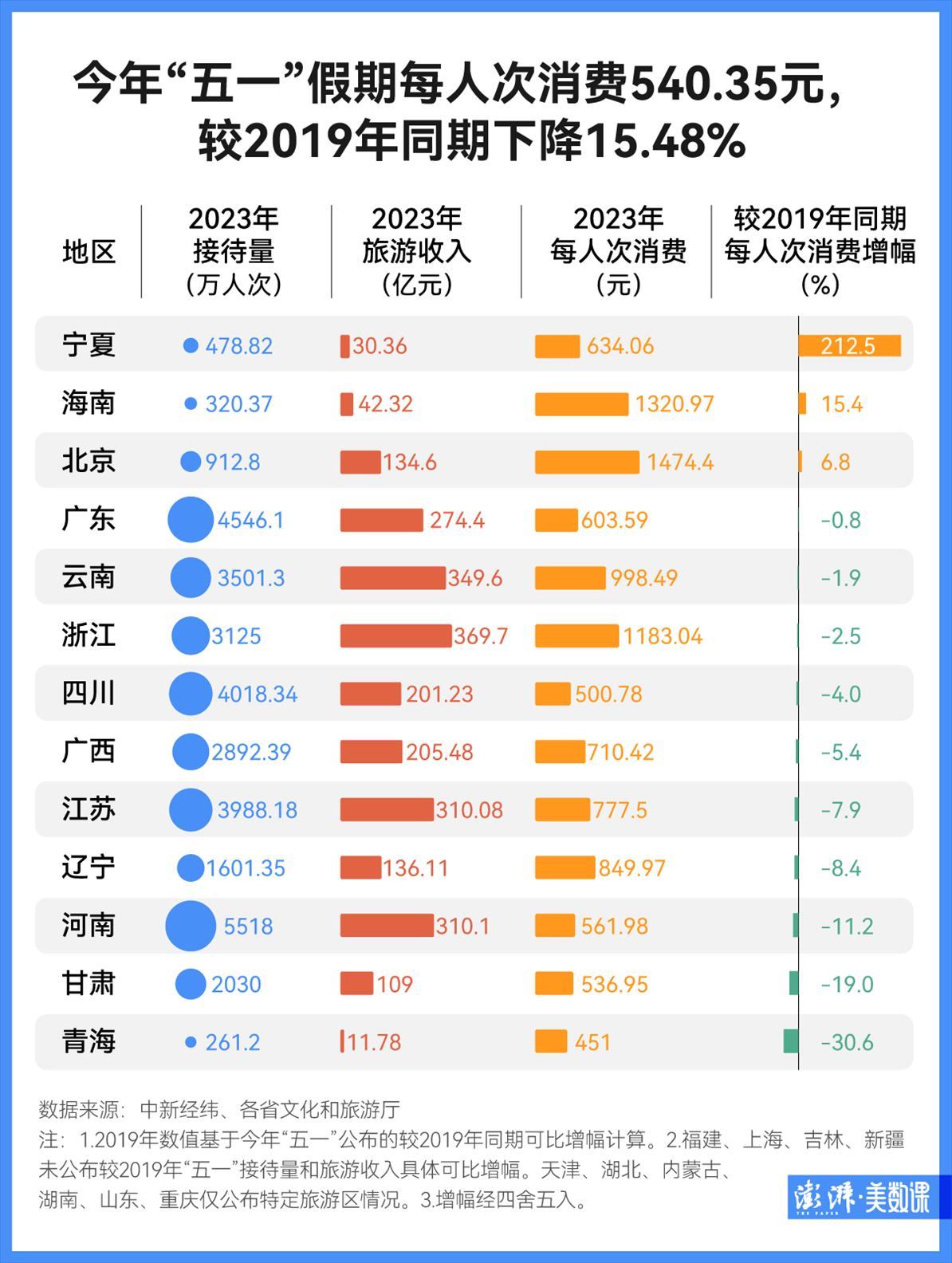 然而,人流井噴的背后,消費卻暫未回歸。以文旅部公布的數據進行計算,今年“五一”假期每人次消費540.35元,較2019年同期下降15.48%。澎湃新聞記者還統計了各省的“五一”消費成績單,發(fā)現大部分省市的每人次消費,較2019年同期皆有所下降。