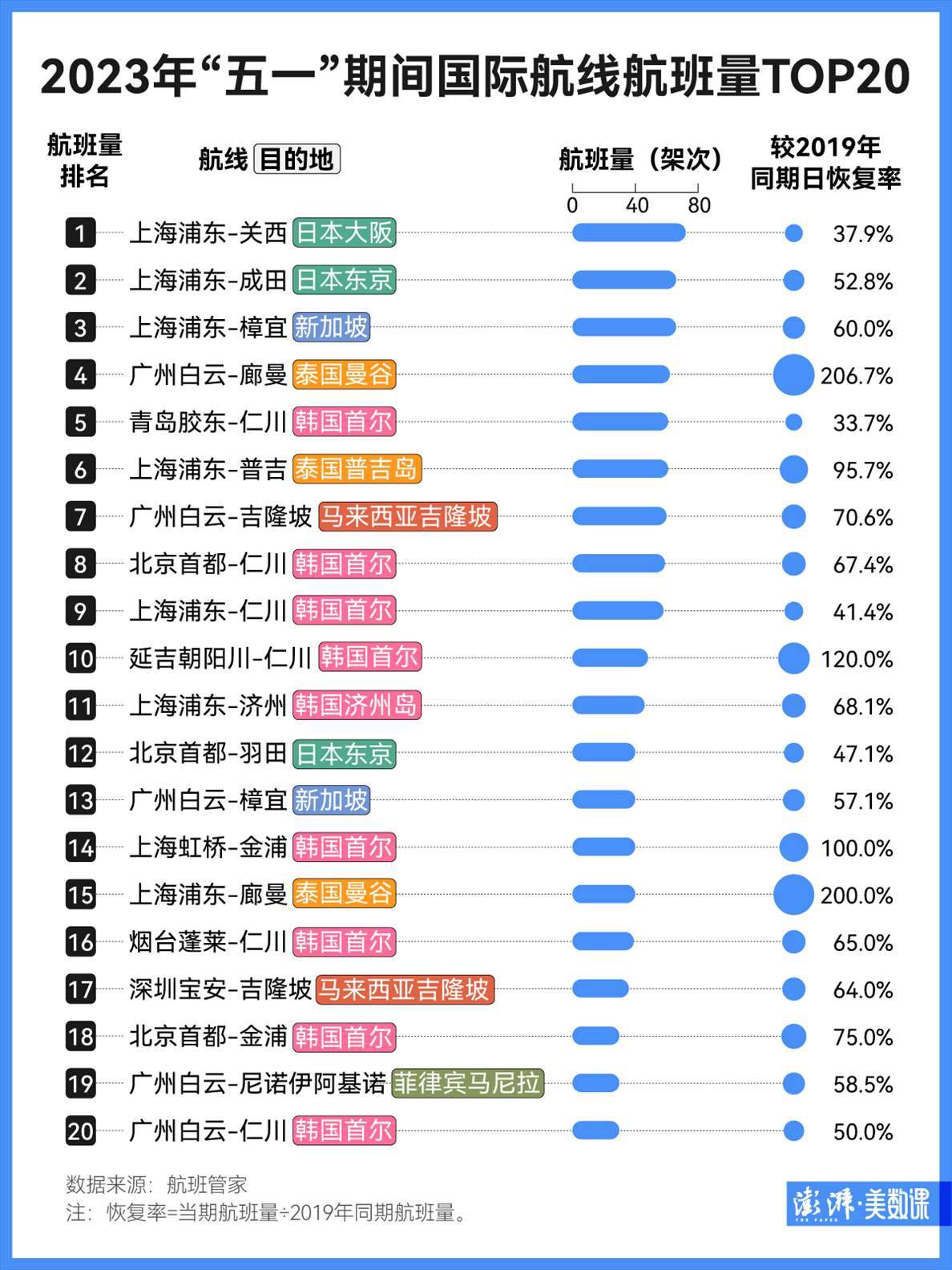 航班恢復程度也反映了旅游的火熱情況。出境游回歸后,受泰國游及韓國游火熱影響,今年“五一”飛往兩國的航班普遍恢復較好。