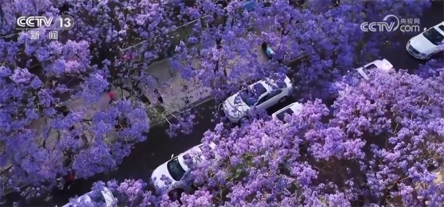 總臺(tái)記者 郭琳潔:我現(xiàn)在是在昆明的教場(chǎng)中路,5月上旬,道路兩側(cè)的藍(lán)花楹競(jìng)相綻放,將這條1.4公里長(zhǎng)的道路裝扮成一條紫色長(zhǎng)廊。