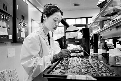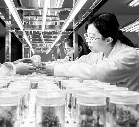 3月29日,在內(nèi)蒙古林業(yè)科學(xué)研究院承擔(dān)的“沙地生物資源保護與培育國家林業(yè)和草原局重點實驗室”,科研人員在觀察黑果枸杞組培苗的培養(yǎng)狀態(tài)。丁根厚攝/光明圖片
