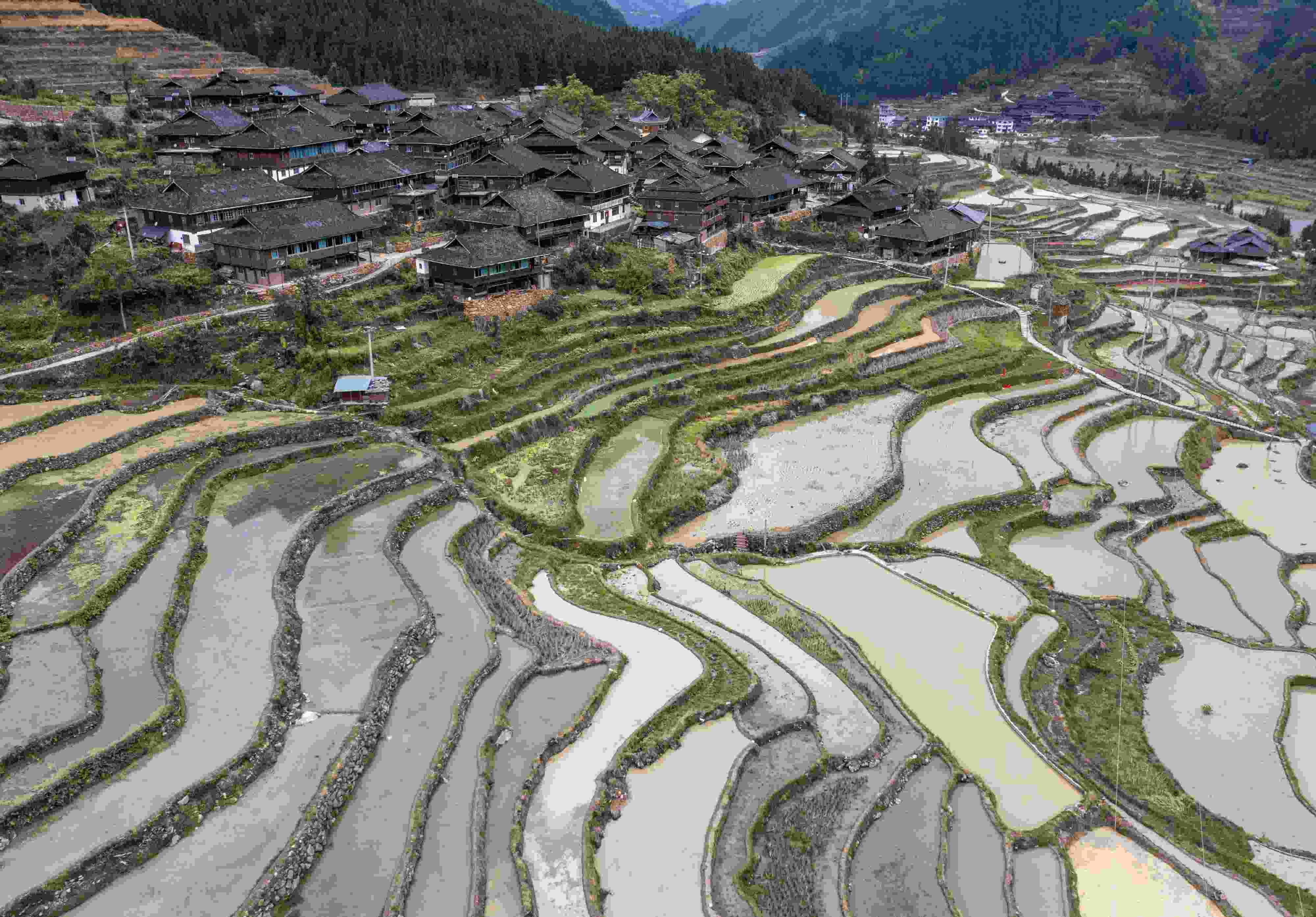 2023年5月7日,貴州省黔東南苗族侗族自治州,從江縣剛邊壯族鄉(xiāng)境內(nèi)田園生機勃勃,翻耕后的層層梯田和青山、河流、村落相映成趣,構(gòu)成一幅鄉(xiāng)村美景圖畫。