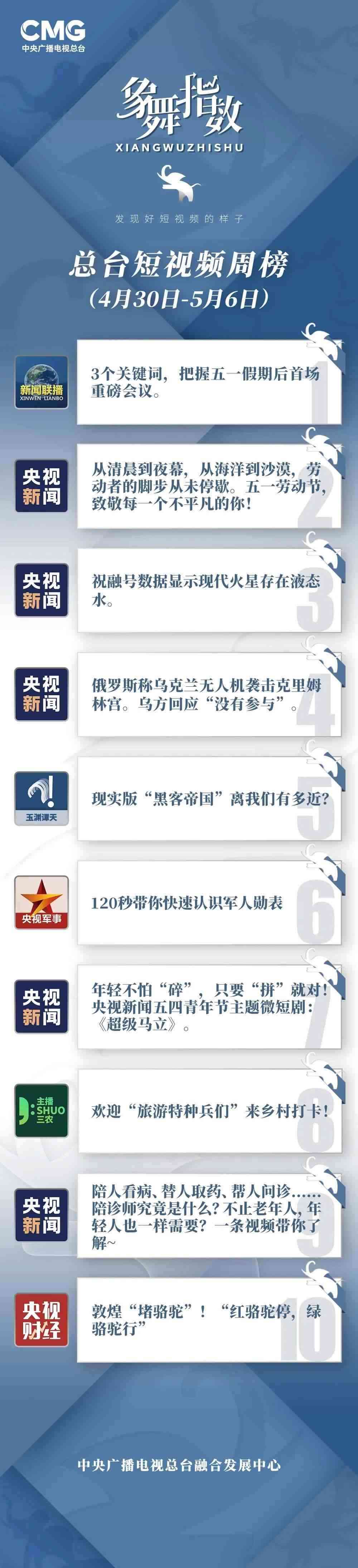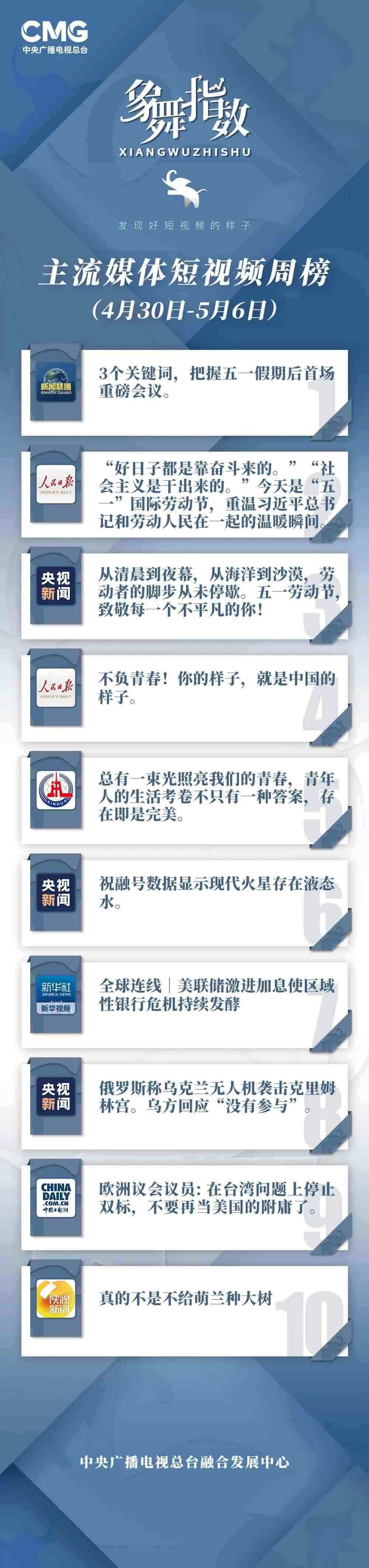 中央廣播電視總臺“象舞指數(shù)”評議品牌,推出主流媒體短視頻周榜、總臺短視頻周榜。在2023年4月30日—5月6日,這些內(nèi)容引發(fā)大眾關注: