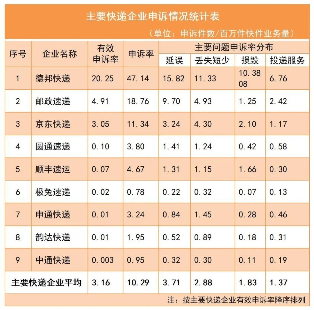 3.主要快遞企業(yè)申訴率情況。主要快遞企業(yè)申訴率(百萬件快件業(yè)務(wù)量)平均為10.29,有效申訴率平均為3.16。用戶對(duì)快遞服務(wù)申訴主要問題中,快件延誤申訴率平均為3.71,快件丟失短少申訴率平均為2.88,快件損毀申訴率平均為1.83,投遞服務(wù)申訴率平均為1.37。