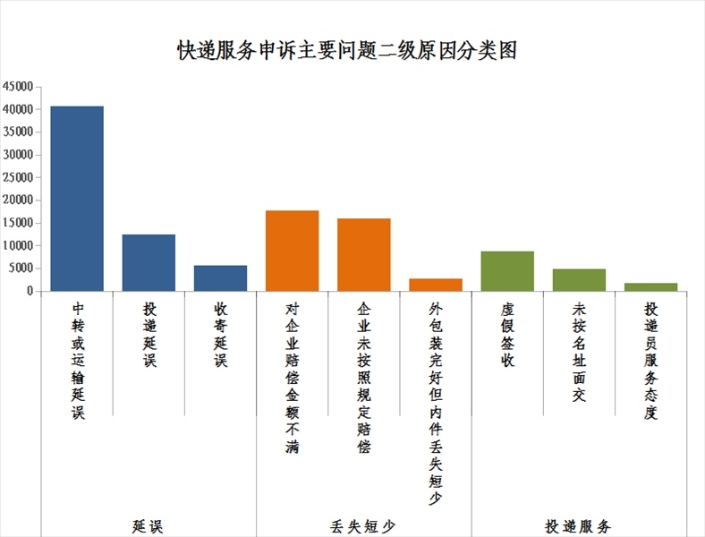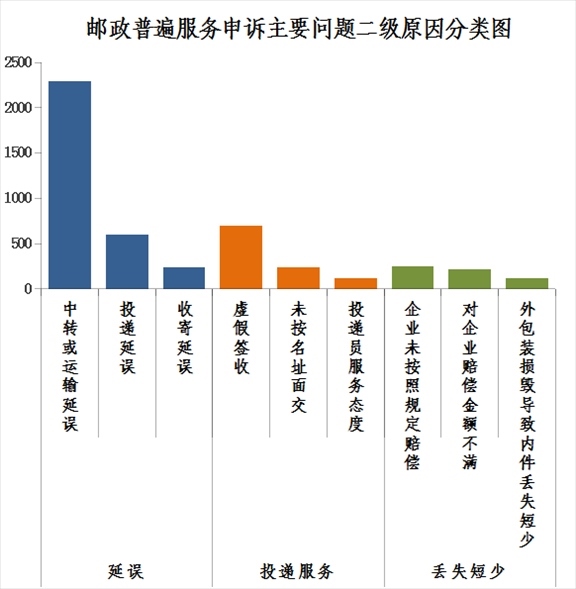 2.郵政普遍服務(wù)申訴主要問題二級(jí)原因情況。郵件延誤申訴中主要占比較多的是中轉(zhuǎn)或運(yùn)輸延誤,投遞服務(wù)申訴中主要占比較多的是虛假簽收,郵件丟失短少申訴中主要占比較多的是企業(yè)未按照規(guī)定賠償。