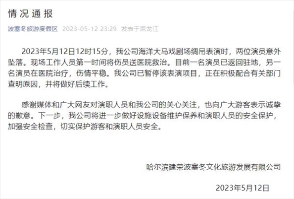·哈爾濱波塞冬旅游度假區(qū)就兩位演員在表演時(shí)意外墜落發(fā)布情況通報(bào),稱(chēng)目前一名演員已返回駐地,另一名演員在醫(yī)院治療,傷情平穩(wěn)。