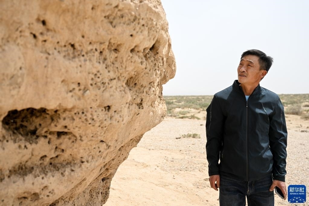 5月13日,駝峰(長城)文物保護隊員布音烏力吉在觀察阿拉善左旗一處烽火臺遺址表面,查看是否有人為破壞痕跡。