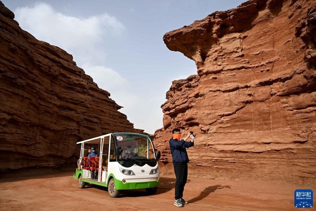 5月13日,游客在內(nèi)蒙古阿拉善盟阿拉善左旗西部夢幻峽谷景區(qū)參觀拍照。