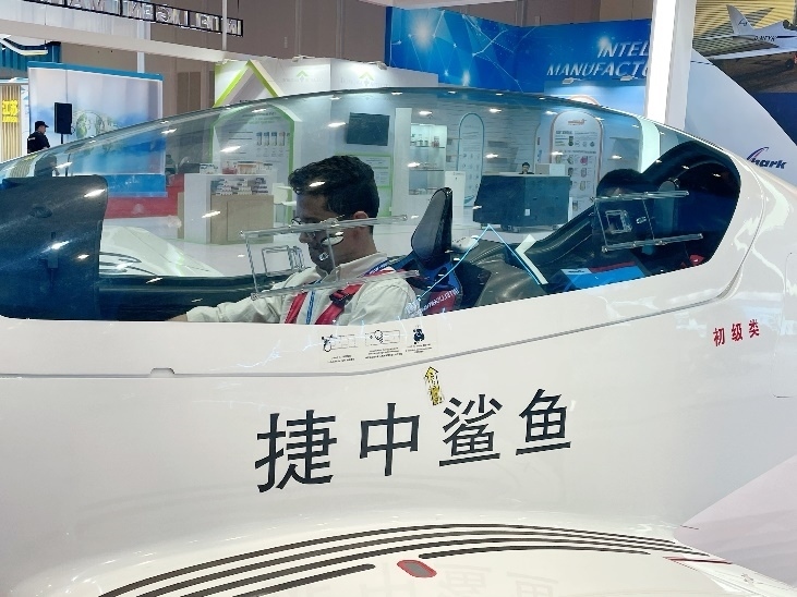 采訪團(tuán)成員在展會體驗(yàn)“鯊魚飛機(jī)”