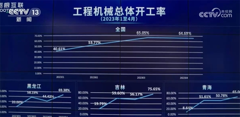 這個大屏幕反映的是全國挖掘機(jī)的開工情況,相關(guān)負(fù)責(zé)人告訴記者,“挖掘機(jī)指數(shù)”顯示出今年我國工程機(jī)械行業(yè)開始出現(xiàn)回暖跡象。4月份,全國工程機(jī)械總體開工率為64.69%,環(huán)比3月基本持平。12個?。▍^(qū)、市)創(chuàng)下今年以來最好成績。