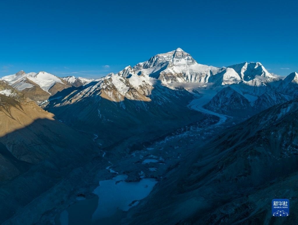 這是日落時(shí)分的珠峰和絨布冰川(5月16日攝,無人機(jī)照片)。