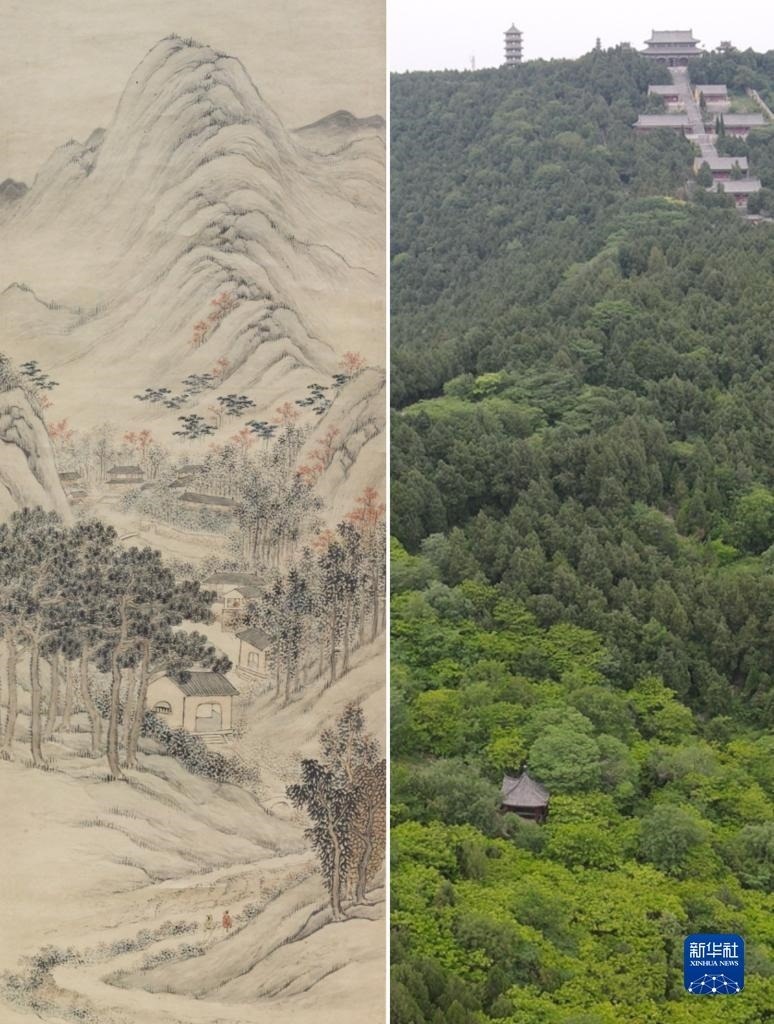 這是一張拼版照片,左圖為:《八公秋霽圖》,由清代畫家潘思牧創(chuàng)作,現(xiàn)收藏于安徽博物院(新華社發(fā),李鵬飛 攝);右圖為:5月16日拍攝的位于安徽省淮南市壽縣的八公山風(fēng)景區(qū)(無人機照片,新華社記者張端攝)。