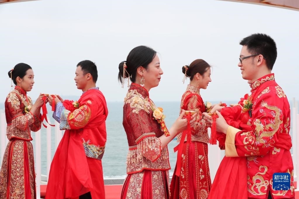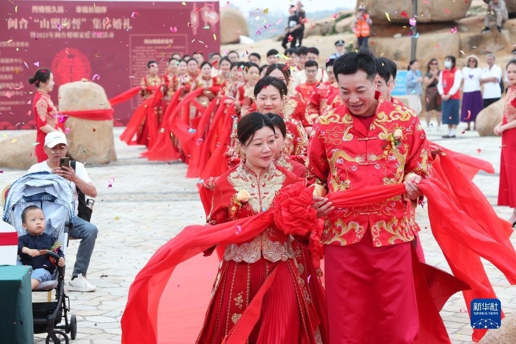 當(dāng)日,一場(chǎng)以“愛情恒久遠(yuǎn)、幸福長相伴”為主題的閩臺(tái)“山盟海誓”集體婚禮暨2023年閩臺(tái)婚姻家庭交流活動(dòng)在福建省福州市平潭縣舉辦。21對(duì)閩臺(tái)新人身穿紅色中式婚服,手牽紅繡球,行跨火盆、踩瓦片、扎繡球和“合茶”、“合巹”、“海誓”等閩臺(tái)傳統(tǒng)結(jié)婚禮儀,結(jié)下跨越海峽的姻緣。