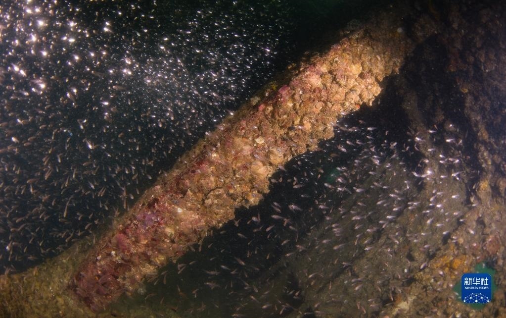 這是在蜈支洲島海域海洋牧場(chǎng)沉船魚(yú)礁內(nèi)拍攝的魚(yú)群(5月16日攝)。