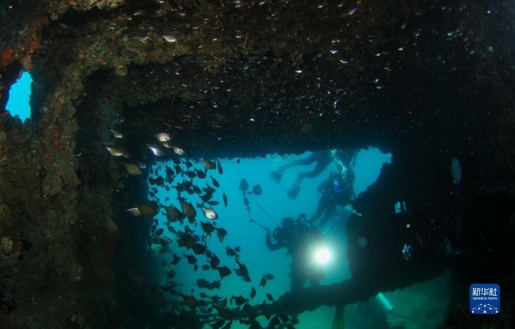 攝影愛(ài)好者在蜈支洲島海域海洋牧場(chǎng)拍攝沉船魚(yú)礁內(nèi)的魚(yú)群(2021年5月21日攝)。