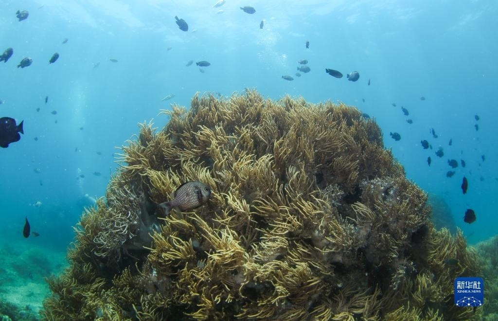 這是在蜈支洲島海域海洋牧場(chǎng)拍攝的珊瑚和魚(yú)群(2021年5月21日攝)。