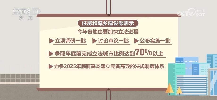 住房城鄉(xiāng)建設(shè)部表示,2023年,各地也要加快立法進(jìn)程,立項(xiàng)調(diào)研一批、討論審議一批、公布實(shí)施一批,爭(zhēng)取年底前完成立法城市比例達(dá)到70%以上,力爭(zhēng)2025年底前基本建立完備高效的法規(guī)制度體系。