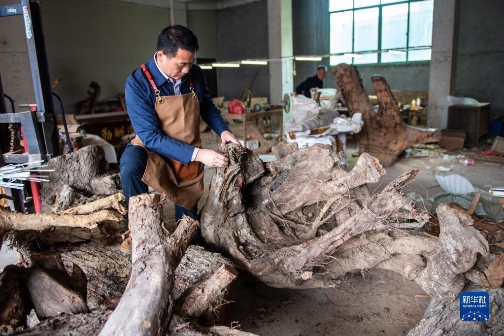5月23日,在洞口縣巖山鎮(zhèn)陽(yáng)家山村,洞口木雕非遺傳承人傅立先在挑選木雕材料。