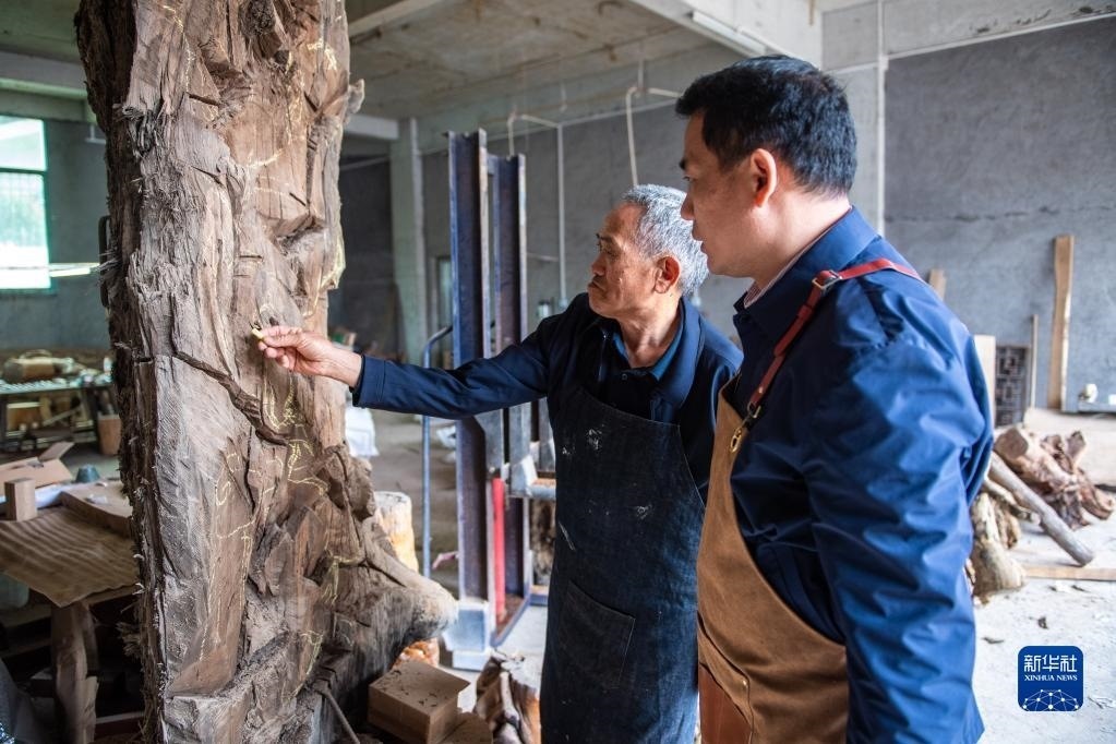 5月23日,在洞口縣巖山鎮(zhèn)陽(yáng)家山村,洞口木雕非遺傳承人傅立先(左)和父親傅金林在創(chuàng)作木雕作品。