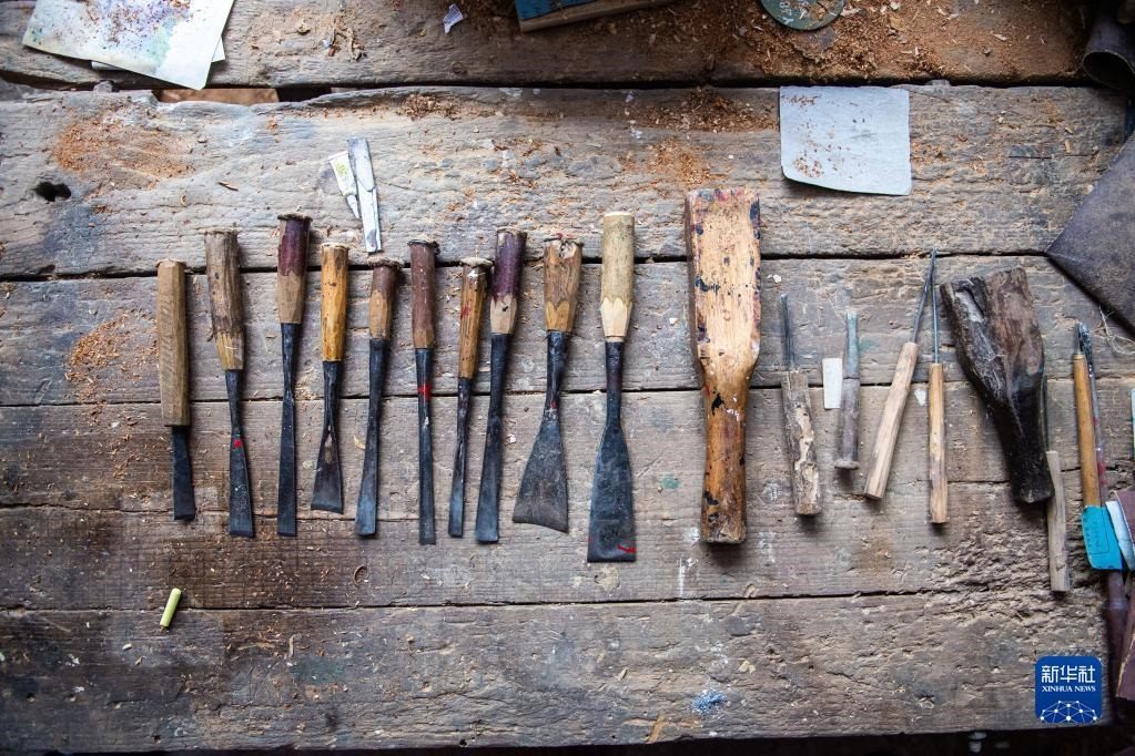 這是5月23日在洞口縣巖山鎮(zhèn)陽(yáng)家山村拍攝的制作洞口木雕的工具。
