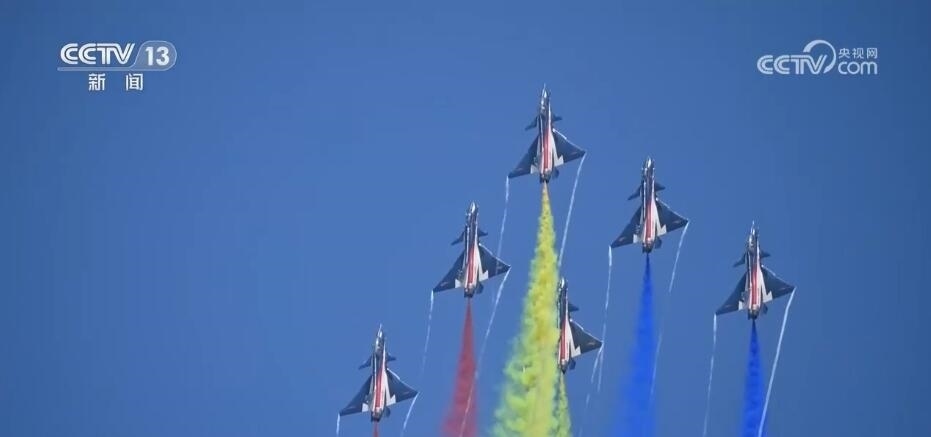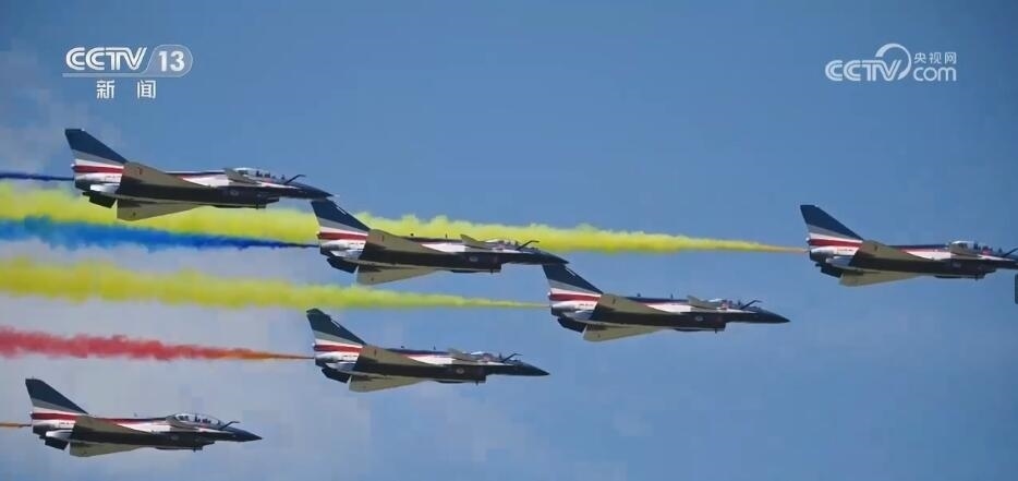 隨著滑出指令下達(dá),噴著五星紅旗涂裝的6架表演機(jī)緩緩駛向起飛線。6架表演機(jī)在云底高度1000米氣象條件下依次起飛,在空中迅速集結(jié)組成箭形編隊。以人字形編隊低空通場,在空中以六道絢麗彩煙,以特殊禮儀向現(xiàn)場致以最崇高的敬意。