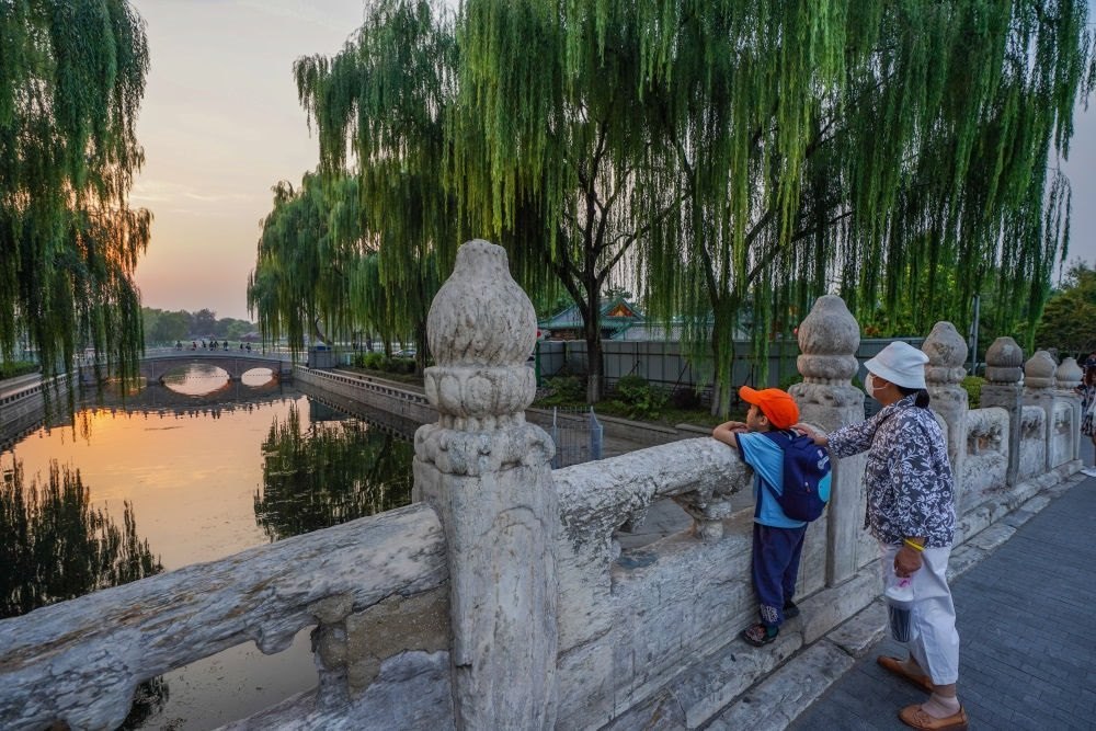 市民在京杭大運(yùn)河和北京中軸線交匯點(diǎn)的萬(wàn)寧橋上眺望什剎海(2022年9月28日攝)。新華社記者 陳鐘昊 攝