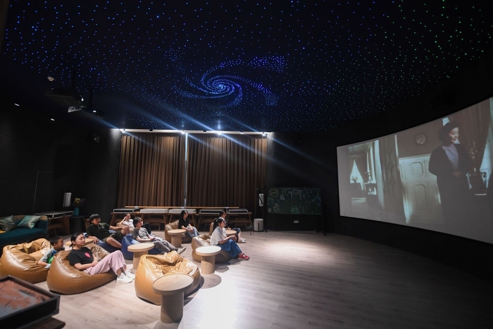 居民在位于浙江省杭州市富陽(yáng)區(qū)銀湖街道硅谷社區(qū)的“合之舍”書房的影視廳觀看電影,該書房是銀湖街道“15分鐘品質(zhì)文化生活圈”的示范點(diǎn)位(2022年7月2日攝)。新華社記者 徐昱 攝