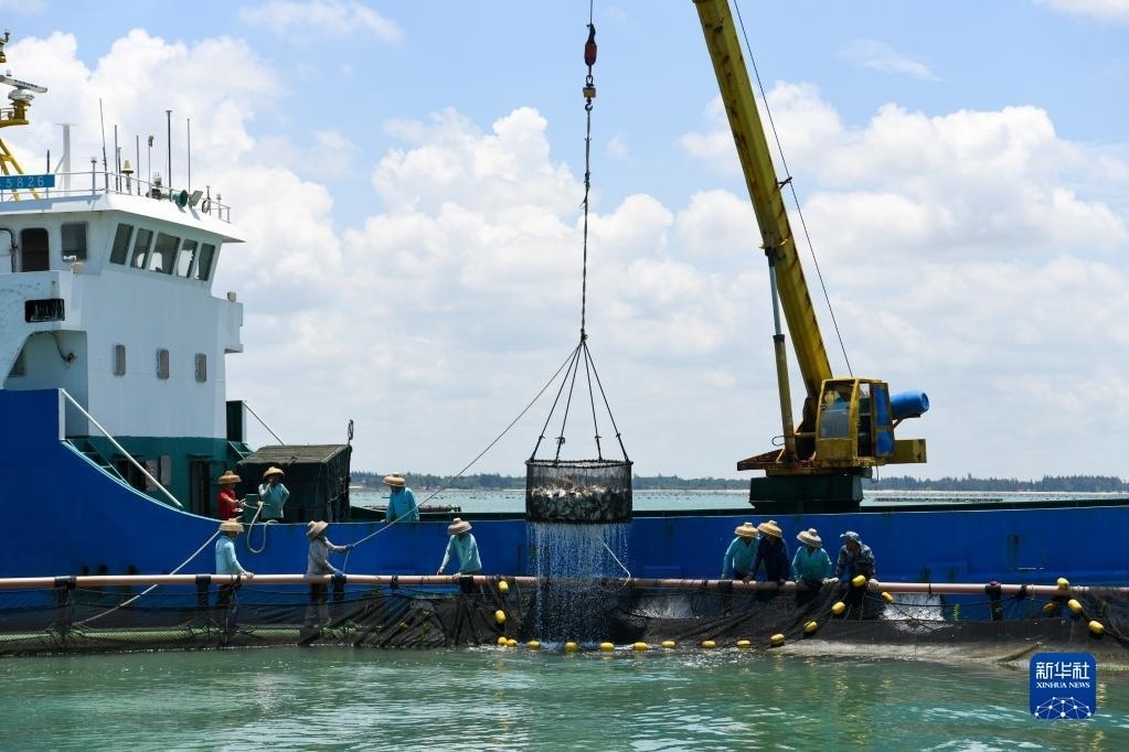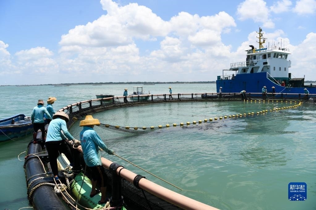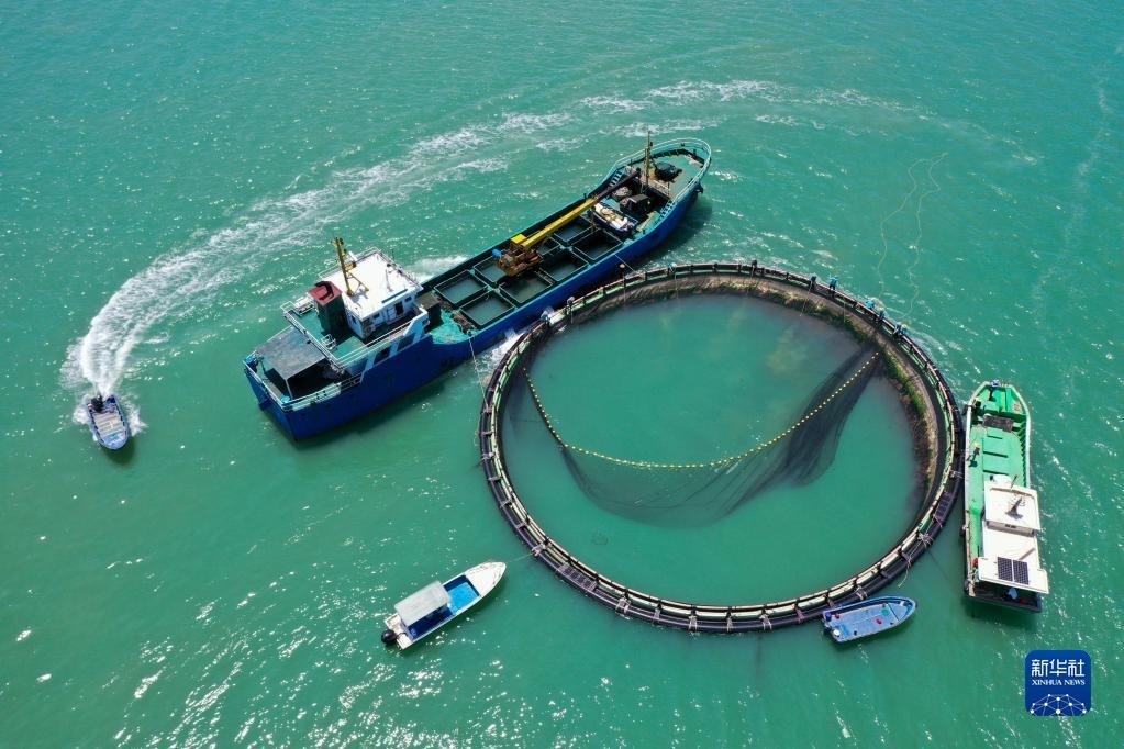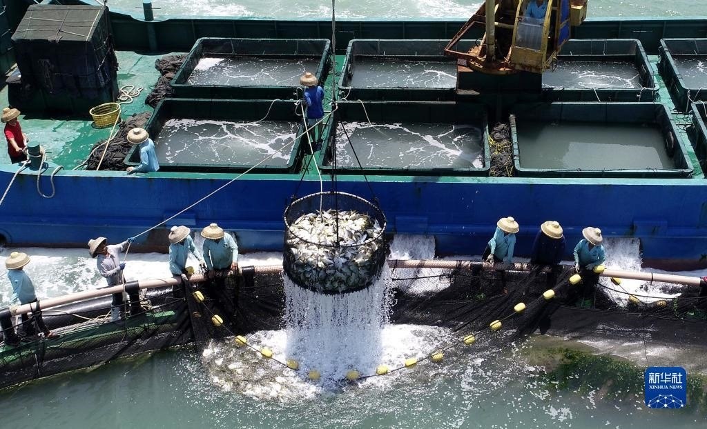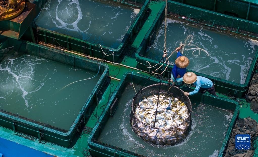 5月27日,在湛江市徐聞縣西連鎮(zhèn),漁業(yè)工人從徐聞國橋深海養(yǎng)殖有限公司的金鯧魚深海網(wǎng)箱捕魚(無人機(jī)照片)。