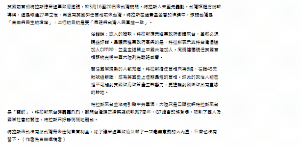 這兩天,譚主發(fā)現(xiàn)臺(tái)灣中時(shí)新聞網(wǎng)刊發(fā)了一篇快評文章:《特拉斯悄悄走了》。文章說到:特拉斯來臺(tái)沒有給臺(tái)灣帶來任何實(shí)質(zhì)利益,除了讓民進(jìn)黨當(dāng)局又做了一次毫無意義的大內(nèi)宣,什么也沒有留下。