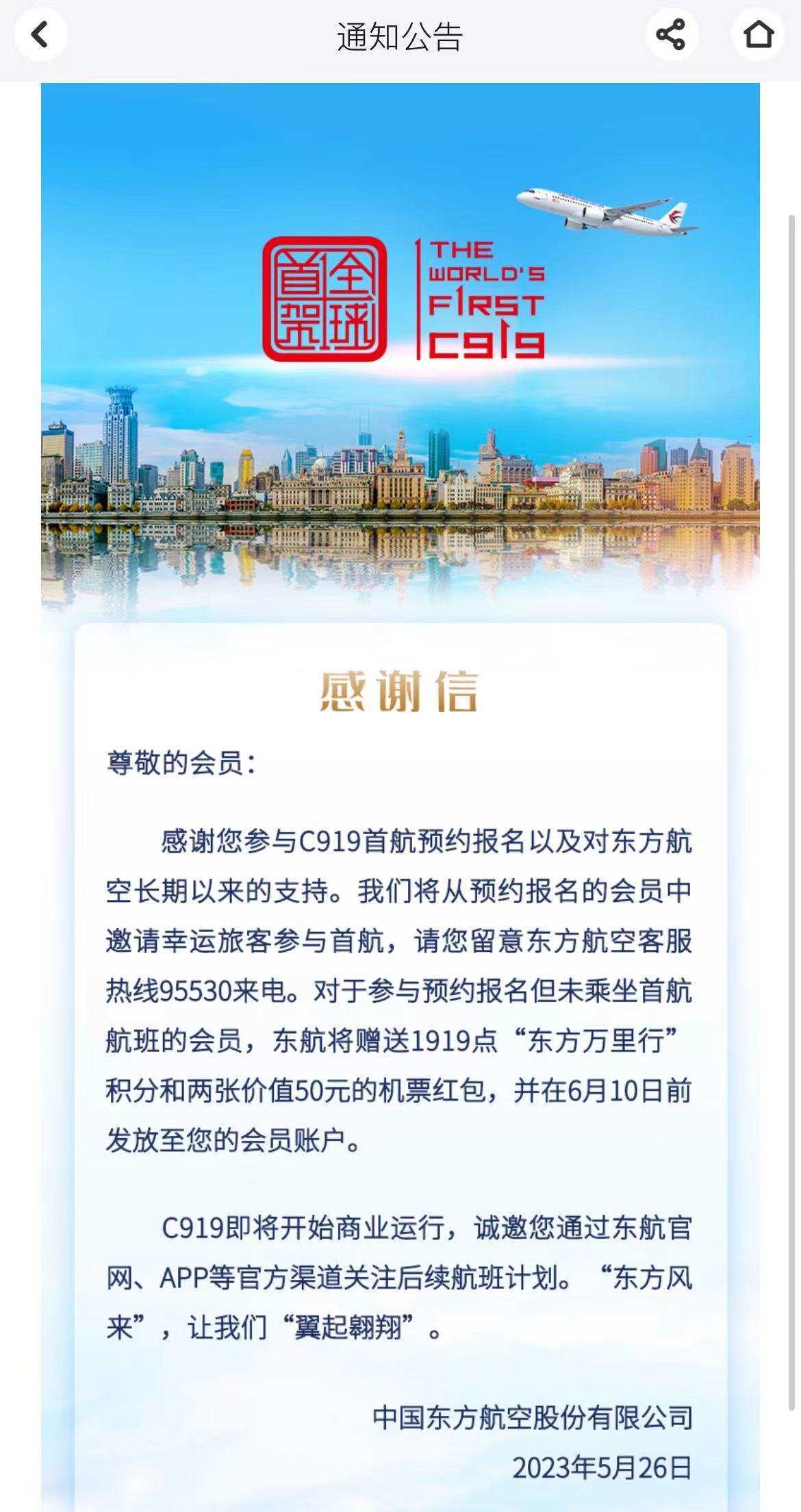 東航APP上還發(fā)布了一則感謝信,信中表示,C919即將開始商業(yè)運(yùn)行,東航將從預(yù)約報(bào)名的會員中邀請幸運(yùn)旅客參與首航,對于參與預(yù)約報(bào)名但未乘坐首航航班的會員,東航將贈送1919點(diǎn)“東方萬里行”積分和兩張價值50元的機(jī)票紅包,并在6月10日前發(fā)放至?xí)T賬戶。
