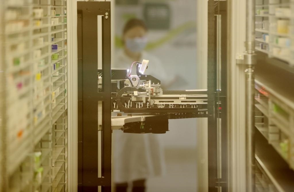 4月2日,浙江省德清縣第三人民醫(yī)院智慧藥房發(fā)藥機器人在配藥。新華社發(fā)(謝尚國攝)