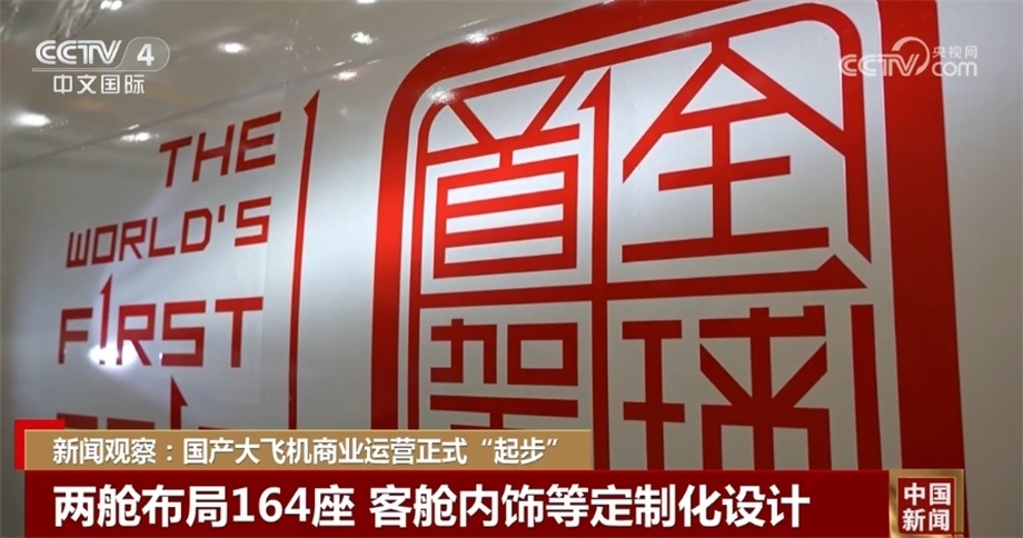 今天執(zhí)行商業(yè)首飛的C919飛機為164座兩艙布局,公務艙8座,經濟艙156座??团搩蕊?、旅客座椅、機載娛樂系統(tǒng)和飛機外部涂裝做了定制化設計。機身前部印有“全球首架”的“中國印”標識和對應英文。飛機注冊號B-919A,“B”代表飛機的中國國籍,“919”和型號名稱契合,“A”則有首架之意,突顯這一全球新機型、全球首架的非凡意義。