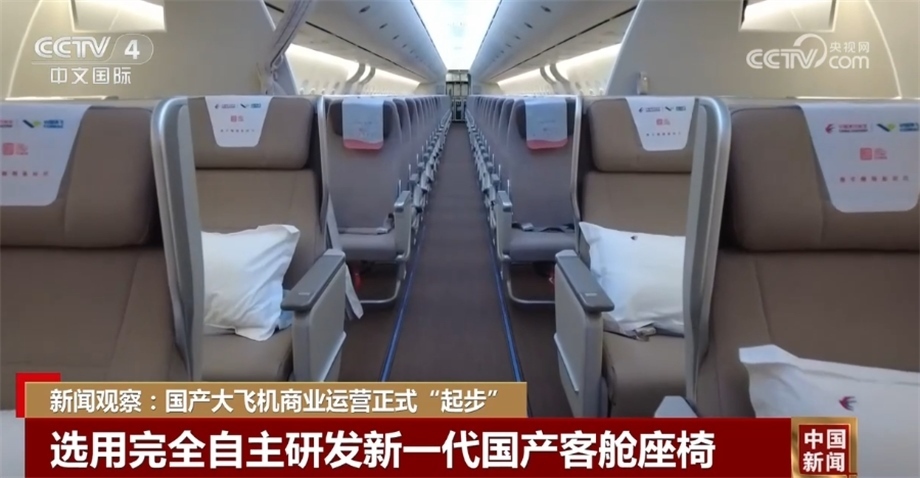 另外,飛機公務艙、經濟艙均選用完全自主研發(fā)的新一代國產客艙座椅。其中,8個公務艙座椅為全鋁合金框架結構,采用搖籃式設計,后靠可達120度,前后座椅間距超過1米;156個經濟艙設計采用3-3布局,中間座位比兩邊座位寬1.5厘米;加上C919客艙擁有2.25米的過道高度,旅客能感受到舒適的頂部和前方視覺空間。