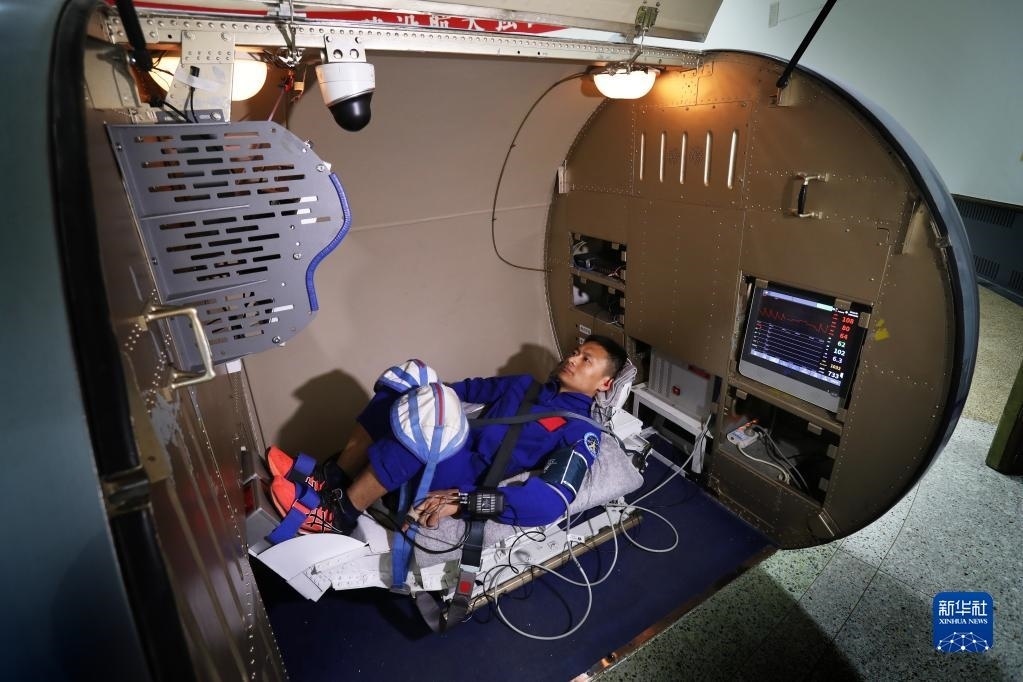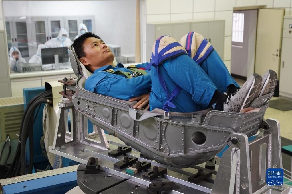 神舟十六號航天員朱楊柱在進行振動體驗(2022年4月27日攝)。新華社發(fā)(王夏陽 攝)