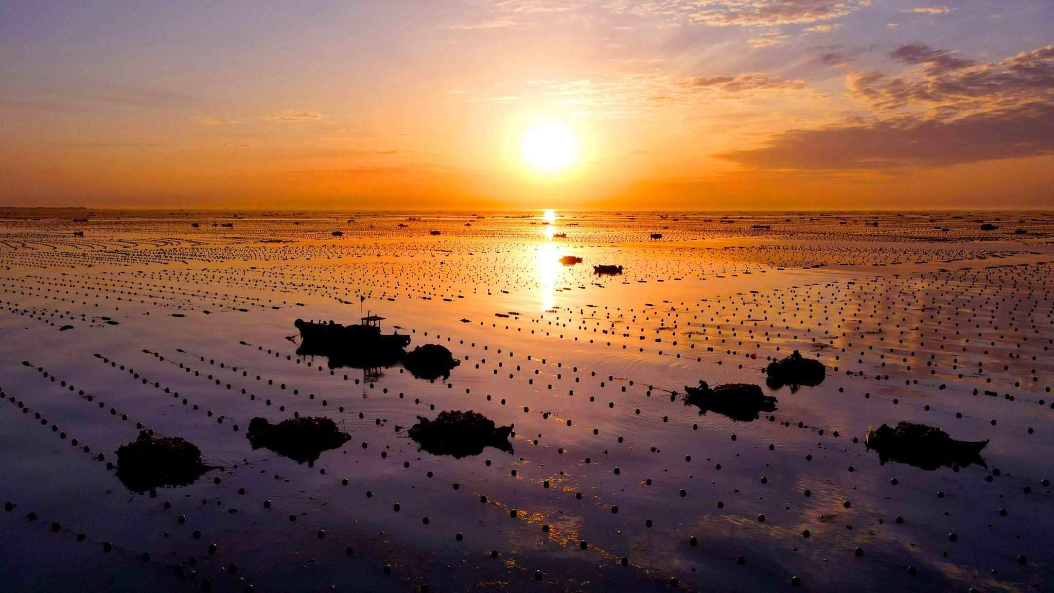 2023年5月31日,山東威海,榮成愛倫灣海洋牧場(chǎng),漁民駕駛船只在海上收獲海帶,美麗的朝霞倒影在海上,海鷗伴舞,海洋牧場(chǎng)到處呈現(xiàn)一派豐收的喜人景象。視覺中國(guó)