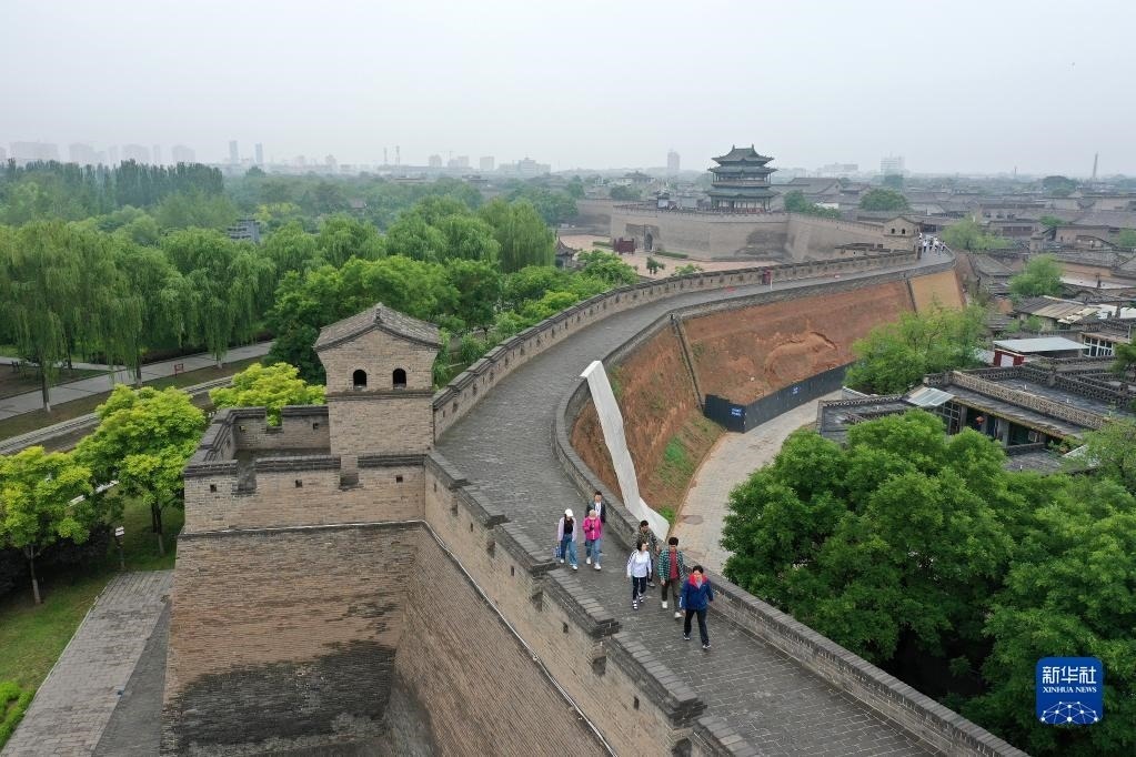 游客在平遙古城城墻上游覽(5月30日攝,無人機(jī)照片)。