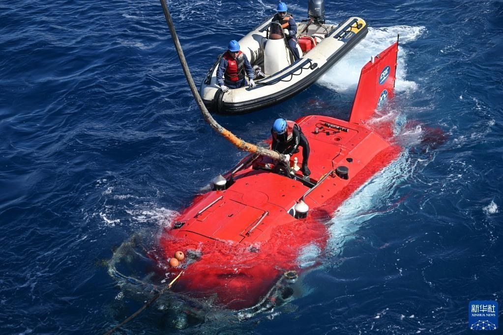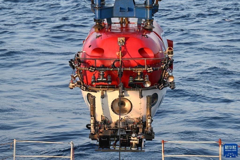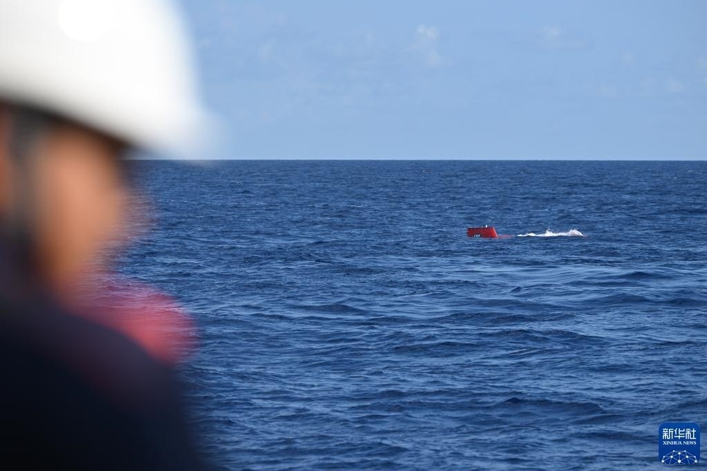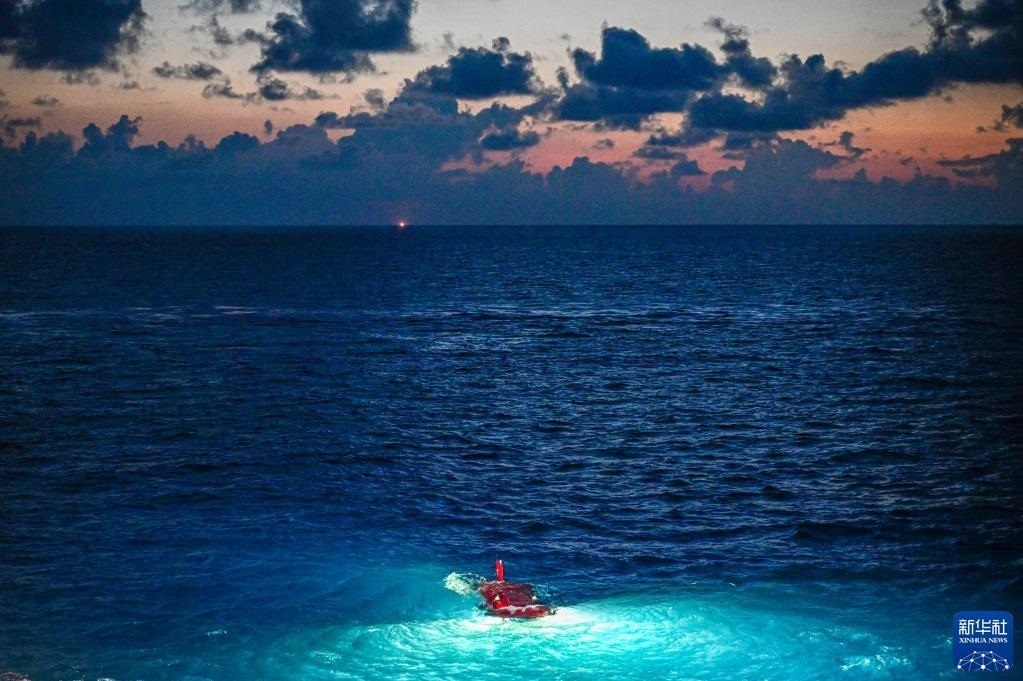 在結(jié)束當(dāng)日的水下調(diào)查后,搭載著考古隊(duì)員的“深海勇士”號(hào)載人潛水器浮出海面(5月27日攝)。