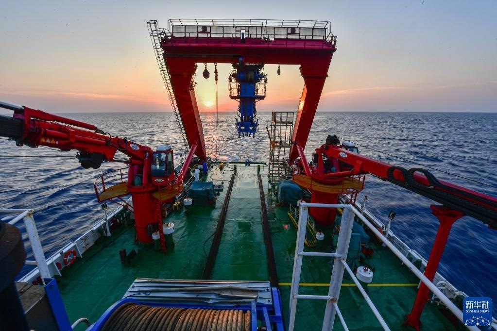 “深海勇士”號(hào)載人潛水器即將下潛開(kāi)始當(dāng)日的水下調(diào)查(5月27日攝)。