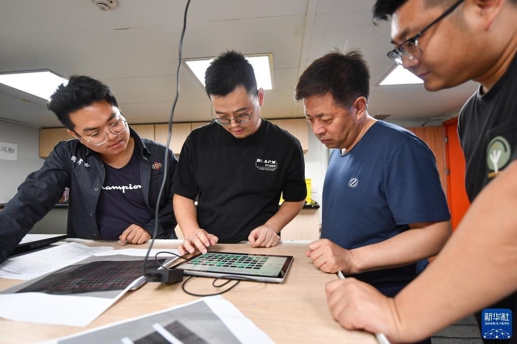 潛航員在“探索一號(hào)”科考船上整理從水下采集的考古數(shù)據(jù)(5月25日攝)。