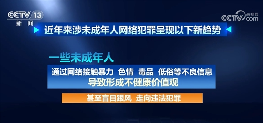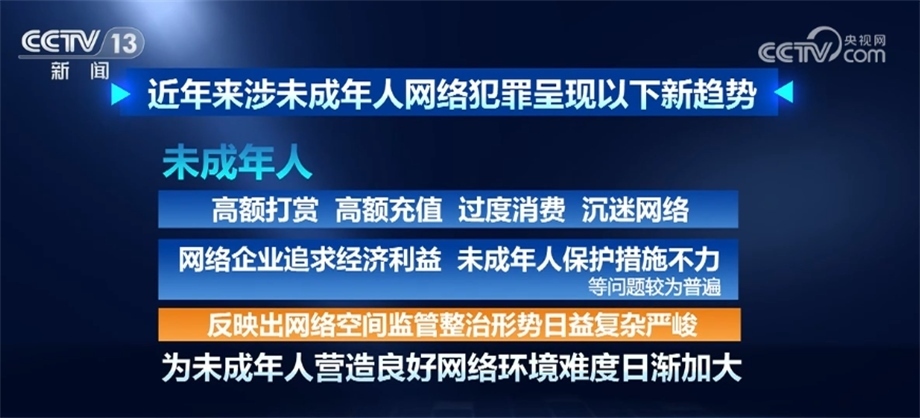 據(jù)最高檢相關(guān)部門負(fù)責(zé)人介紹,近年來涉未成年人網(wǎng)絡(luò)犯罪呈現(xiàn)以下新趨勢:未成年人觸網(wǎng)低齡化日趨明顯,更易遭受網(wǎng)絡(luò)不法侵害;利用網(wǎng)絡(luò)侵害未成年人犯罪手段復(fù)雜多樣,方式不斷翻新,“網(wǎng)絡(luò)誘騙”“隔空猥褻”等新類型犯罪隱蔽性強、打擊難度大;一些未成年人通過網(wǎng)絡(luò)接觸暴力、色情、毒品、低俗等不良信息,導(dǎo)致形成不健康價值觀,甚至盲目跟風(fēng)、走向違法犯罪;未成年人高額打賞、高額充值、過度消費、沉迷網(wǎng)絡(luò),網(wǎng)絡(luò)企業(yè)追求經(jīng)濟利益、未成年人保護(hù)措施不力等問題較為普遍,反映出網(wǎng)絡(luò)空間監(jiān)管整治形勢日益復(fù)雜嚴(yán)峻,為未成年人營造良好網(wǎng)絡(luò)環(huán)境難度日漸加大。