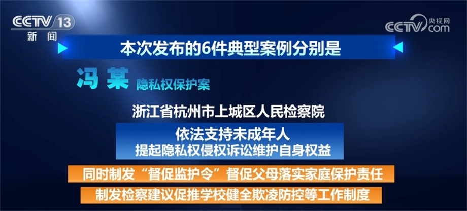 馮某隱私權(quán)保護(hù)案。針對未成年人隱私視頻被轉(zhuǎn)發(fā),生活學(xué)習(xí)受到影響,浙江省杭州市上城區(qū)人民檢察院依法支持未成年人提起隱私權(quán)侵權(quán)訴訟維護(hù)自身權(quán)益。同時,制發(fā)“督促監(jiān)護(hù)令”督促父母落實家庭保護(hù)責(zé)任,制發(fā)檢察建議促推學(xué)校健全欺凌防控等工作制度。