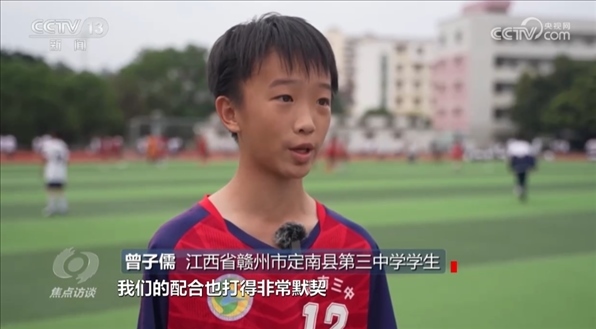 江西省贛州市定南縣第三中學(xué)學(xué)生曾子儒:“踢足球之前自己體弱多病,身體素質(zhì)比較差,別提去踢這么一場(chǎng)激烈的足球比賽,就是讓我圍著操場(chǎng)跑一圈都?xì)獯跤?。?br>