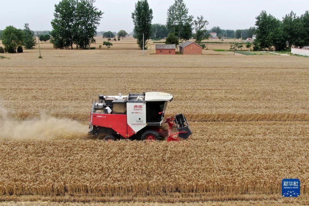6月2日,在安徽省阜陽市阜南縣許堂鄉(xiāng)劉崗村,董斐斐駕駛收割機為村民收割小麥(無人機照片)。