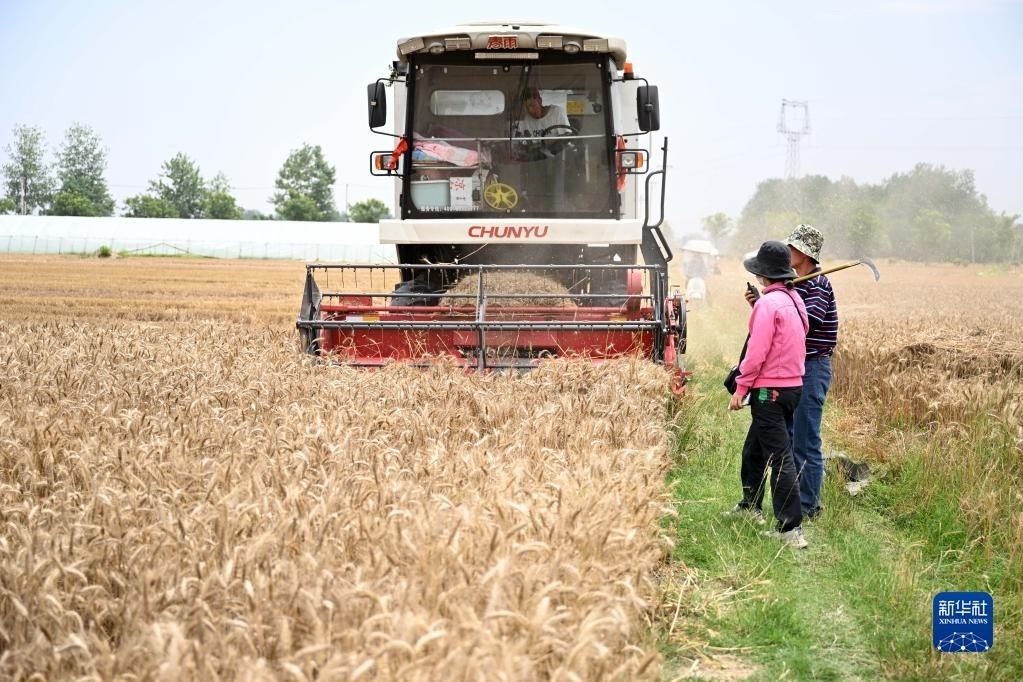 6月2日,在安徽省阜陽市阜南縣許堂鄉(xiāng)劉崗村,董斐斐駕駛收割機為村民收割小麥。