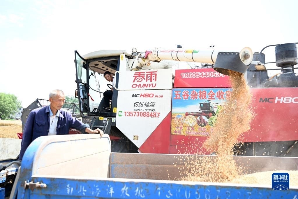 6月2日,在安徽省阜陽市阜南縣許堂鄉(xiāng)劉崗村,董斐斐駕駛收割機將收割的小麥裝車。